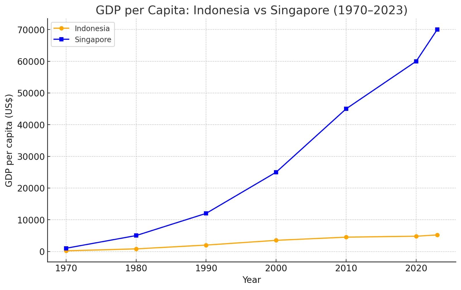 Singapura berhasil menjadi salah satu negara paling sejahtera didunia dengan pendapatan per kapita di tahun 2023 sebesar AS$74.000,- Indonesia AS$5.000,- masih terperangkap dalam negara berpendapatan menengah.